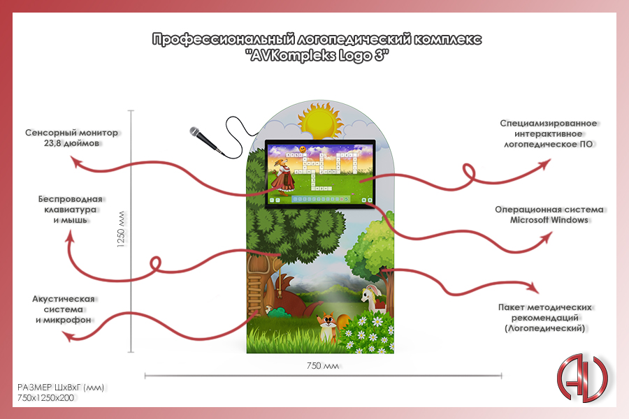 Изготовлен «AVKompleks Logo 3» из безопасного для детей материала: ЛДСП, кромки ПВХ. Сырье не выделяет токсичных веществ. Для управления встроен сенсорный планшет, который поддерживает технологию Multi Touch System, а также беспроводная клавиатура. Таким образом, легко проводить групповые занятия.