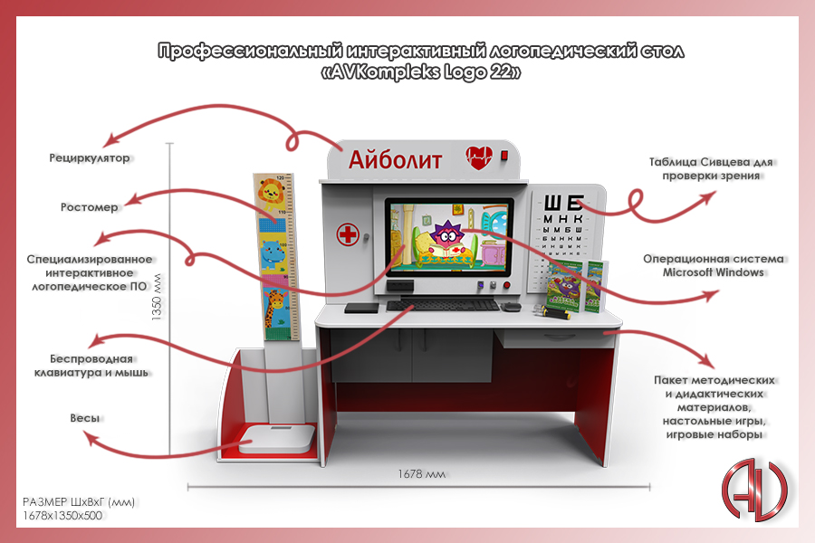 Предлагаем вашему вниманию разработку для эффективного развития детей с дефектами речи – профессиональный интерактивный логопедический стол «AVKompleks Logo 22». Устройство способствует развитию речи, мелкой моторики рук, коммуникативных и творческих навыков, вербальной зрительной памяти, словарного запаса, вниманию, словесно-логическому мышлению.